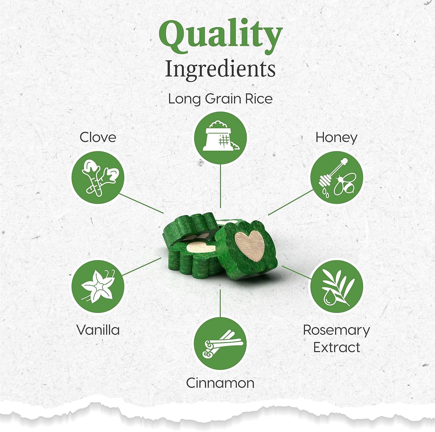 The patented toothpaste soft center chew fights plaque, tartar and bacteria causing bad breath with natural ingredients such as alfalfa, cinnamon, vanilla, and clove.