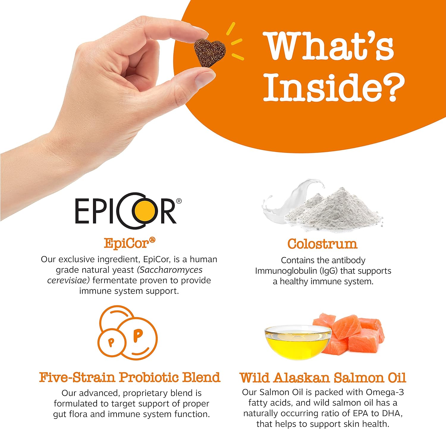 At 80 mg per chew, Epicor contains vitamins, protein, fiber, and antioxidants that are clinically proven to support the body’s natural immune defenses to keep your dog healthy.