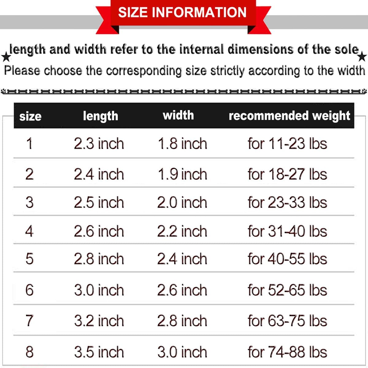 Please be sure to measure the width of your dog’s paws carefully, it is key to choosing the correct size for your dog, weight can only be used as an additional reference; Size 1: 1.7”x2.2”(W*L) for 12-23 lbs; size 2: 1.8”x2.4”(W*L) for 18-27 lbs; size 3: 2.0”x2.5”(W*L) for 23-33 lb; size 4: 2.2”x2.6”(W*L) for 31-40 lbs; size 5: 2.4”x2.8”(W*L) for 40-55 lbs; size 6: 2.6”x3.0”(W*L) for 52-65 lbs; size 7: 2.8”x3.2″(W*L) for 63-75 lbs; size 8: 3.0”x3.3″(W*L) for 74-88 lbs