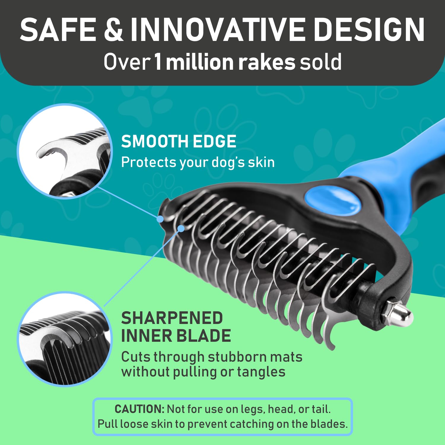 Our dematting and deshedding tool gently removes loose hair and eliminates tangles, knots, dander, and trapped dirt. The perfect cat brush or dog grooming brush solution for pets with thick fur or dense double coats.